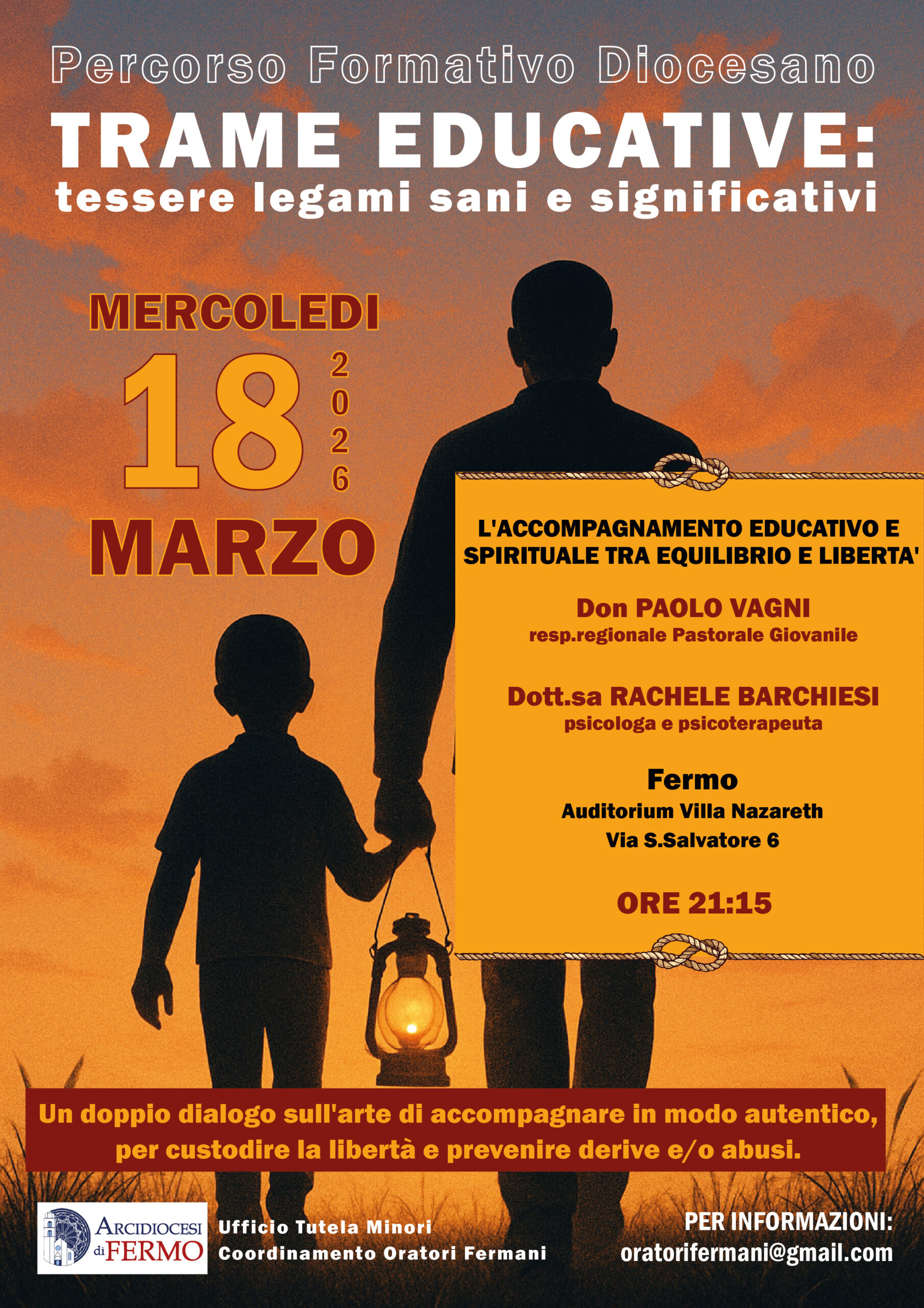 L’appuntamento, dal titolo “L’accompagnamento educativo e spirituale tra equilibrio e libertà”, si terrà a Fermo, mercoledì 18 marzo 2026, alle ore 21.15, presso l’Auditorium di Villa Nazareth.
