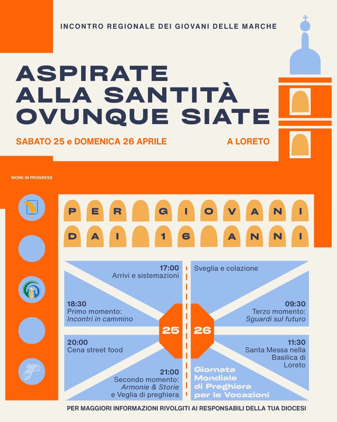 I GIOVANI saranno poi invitati a vivere due giorni speciali sabato 25 e domenica 26 a Loreto, convocati per l’incontro regionale dei giovani delle Marche. (leggi qui per maggiori informazioni).