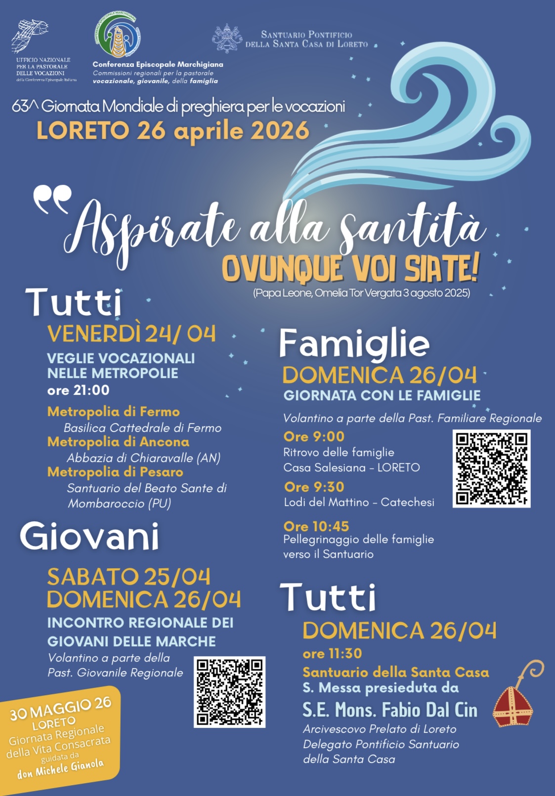 Venerdì 24 aprile, alle ore 21.00, si pregherà in contemporanea nelle Veglie Vocazionali organizzate nelle tre metropolie della Regione: nella Cattedrale Metropolitana di Santa Maria Assunta in cielo (Fermo), nella Abbazia di Chiaravalle (Ancona) e al Santuario del Beato Santo di Mombaroccio (Pesaro). Tutte i fedeli delle comunità diocesane sono invitati a partecipare.