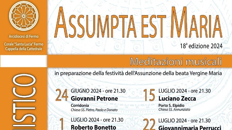 FERMO – Si apre lunedì 24 giugno, il prestigioso Festival Organistico “Assumpta est Maria” dell’Arcidiocesi di Fermo, organizzato dalla Corale Santa Lucia – Cappella della Cattedrale, in preparazione alla festività dell’Assunzione della beata Vergine Maria. Il Festival, giunto alla 18ma edizione, si articola in sei appuntamenti distribuiti geograficamente e temporalmente come in una sorta di pellegrinaggio che da Corridonia, attraverso la valle del Chienti, giungerà in Cattedrale per rendere omaggio all’Assunta in cielo. Nelle diverse tappe si intende anche valorizzare il ricco patrimonio organario presente nell’Arcidiocesi, dagli antichi organi recentemente restaurati agli strumenti di più recente costruzione. Filo conduttore delle meditazioni sarà la narrazione della Vita di Maria attraverso letture tratte dal libro “L’angelo mi disse: autobiografia di Maria” del Cardinale Angelo Comastri. Il primo appuntamento, di lunedì 24 giugno alle ore 21.30, si terrà nella Chiesa SS. Pietro, Paolo e Donato di Corridonia. Alla consolle del grande organo Morettini siederà l’organista Giovanni Petrone di Campobasso. Le letture saranno a cura di Elena Cupidio. L’organizzazione di questi eventi è stata resa possibile grazie al contributo dell’Otto per mille alla Chiesa Cattolica, della Fondazione Cassa di Risparmio di Fermo e delle Parrocchie.