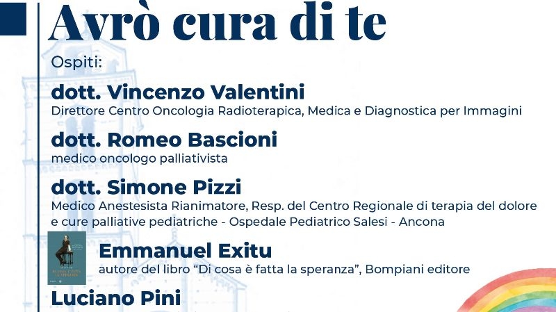 Interverranno: il dott. Vincenzo Valentini, direttore del Centro di Oncologia radioterapica, medica e diagnostica per immagini; il dott. Romeo Bascioni, medico oncologo palliativista, il dott. Simone Pizzi, medico anestesista rianimazione, responsabile del Centro Regionale di terapia del dolore e cure palliative pediatriche all’Ospedale Pediatrico Salesi di Ancona; Emmanuel Exitu, autore del libro “Di cosa è fatta la speranza”. Bompiani editore; Luciano Pini, Presidente dell’Associazione “L’Abbraccio”.