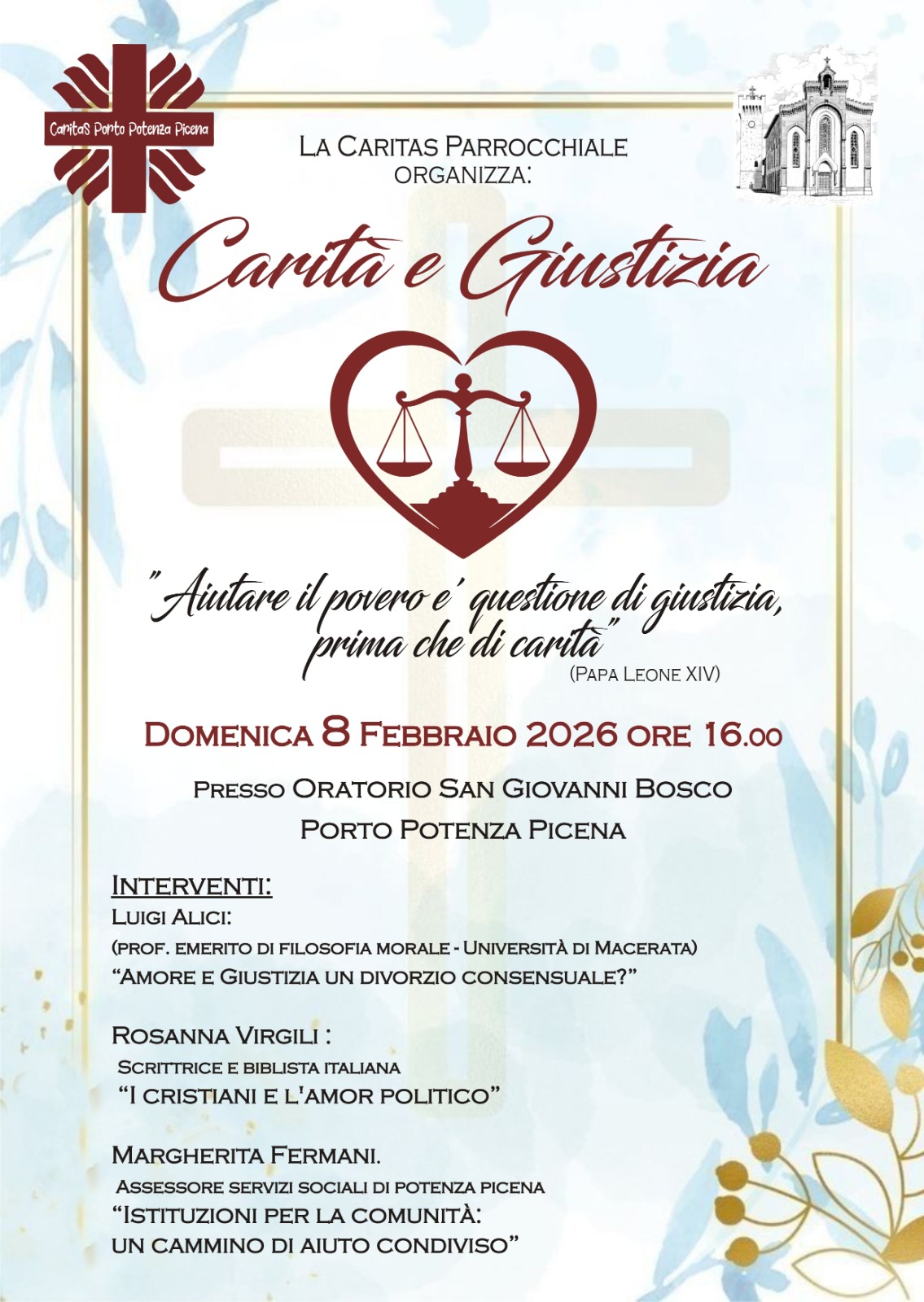 È in programma per domenica 8 febbraio, alle ore 16.00 presso l’oratorio San Giovanni Bosco di Porto Potenza Picena, un incontro dal titolo “Carità e Giustizia”, organizzato dalla Caritas Parrocchiale.