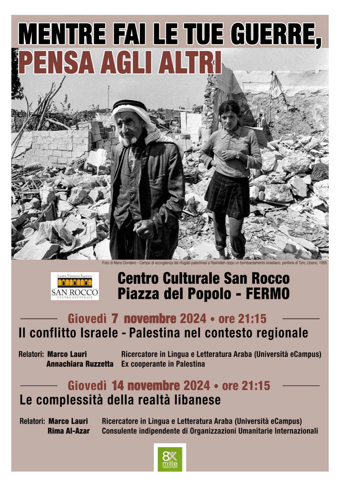 Il Centro Culturale San Rocco ha voluto affidarsi alle esperienze e ai saperi di persone che, per studio e per contatto diretto, possono offrire visioni approfondite e accurate dell’attuale situazione medio-orientale.