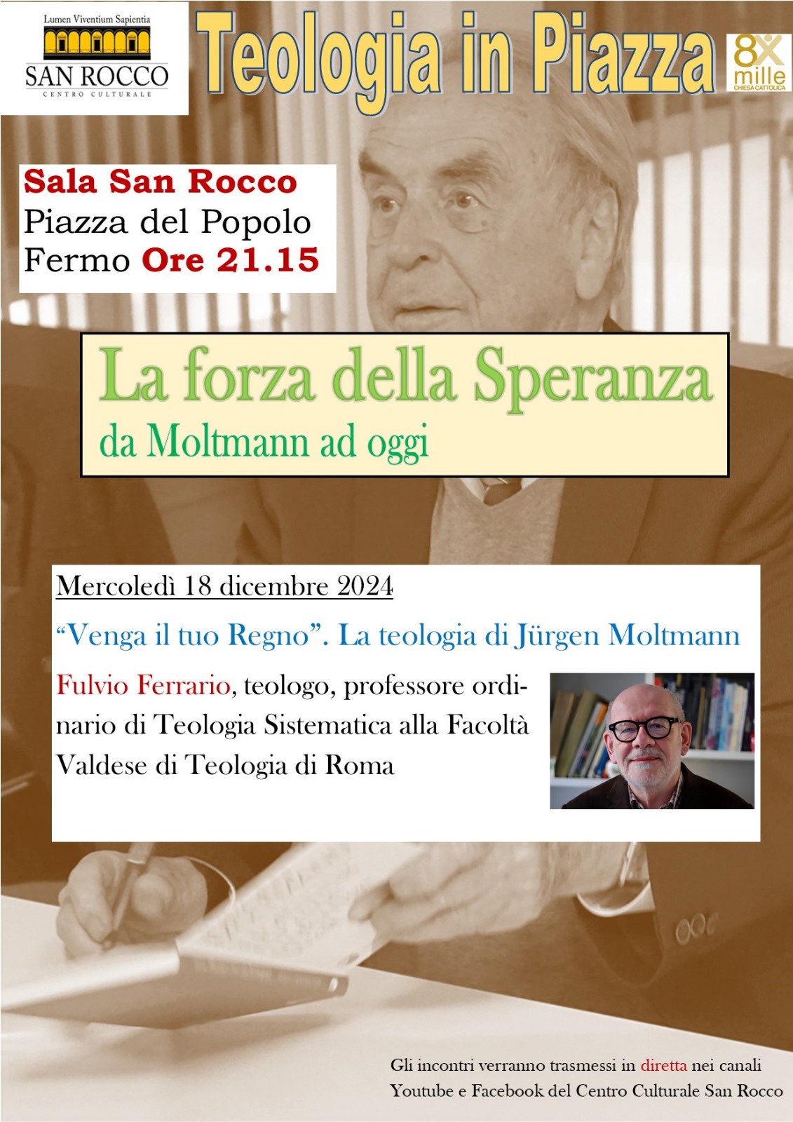 Mercoledì 18 dicembre si terrà il quarto e ultimo incontro della serie “Teologia in Piazza. La forza della speranza da Moltmann ad Oggi”. Interverrà come relatore il prof. Fulvio Ferrario, docente di Teologia Sistematica alla Facoltà Valdese di Teologia di Roma. Il prof. Ferrario è uno dei più importanti teologi italiani, concluderà il ciclo della teologia della speranza con una relazione dal titolo “Venga il tuo Regno. La teologia di Jürgen Moltmann”.
