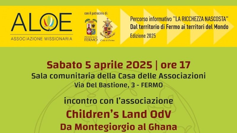 Sabato 5 Aprile alle ore 17, presso la Casa delle Associazioni (Via del Bastione 3 a Fermo), l’Associazione ALOE ospiterà Fernando Gentili, fondatore di Children’s Land, associazione umanitaria di Montegiorgio che dal 2003 opera in Ghana per aiutare i bambini meno fortunati. Un’occasione per conoscere un progetto di solidarietà nato nel nostro territorio e che merita di essere scoperto.