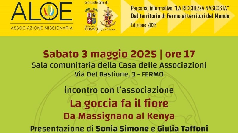 Vi invitiamo pertanto ad unirvi a noi Sabato 03 Maggio 2025, alle ore 17.00, presso la Casa delle Associazioni, via del Bastione n. 3, a Fermo. Avremo la possibilità di ascoltare direttamente da due delle protagoniste di questa ormai ventennale storia di solidarietà tra Massignano e il Kenya, Sonia Simone e Giulia Taffoni, le attività e le realizzazioni portate avanti in favore dei bambini di strada. Vi aspettiamo.