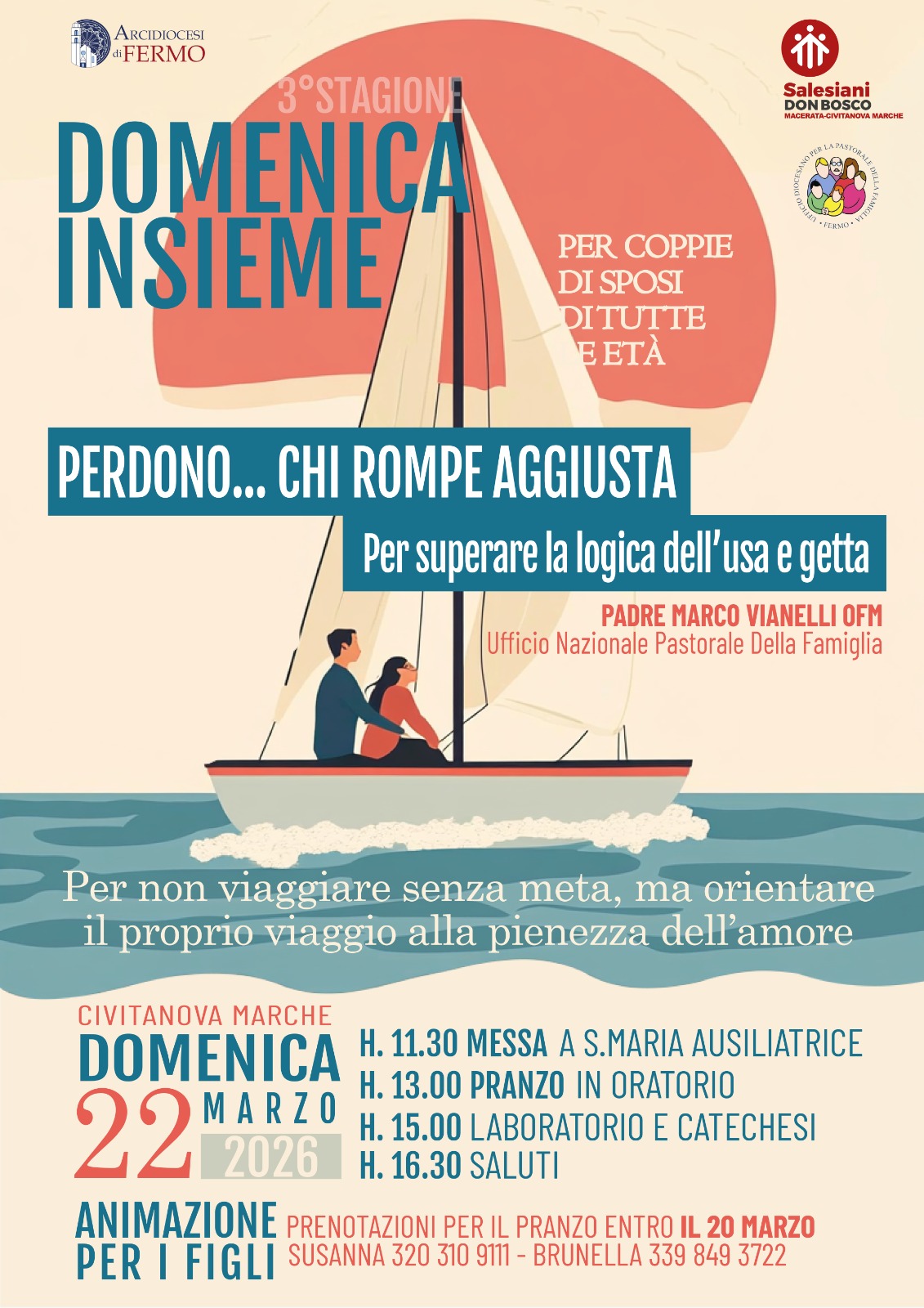 Va in questa direzione “Domenica Insieme”, l’iniziativa dedicata alle coppie di sposi di tutte le età, in programma domenica 22 marzo 2026 a Civitanova Marche, promossa dalle famiglie salesiane e dalla pastorale familiare dell’Arcidiocesi di Fermo.