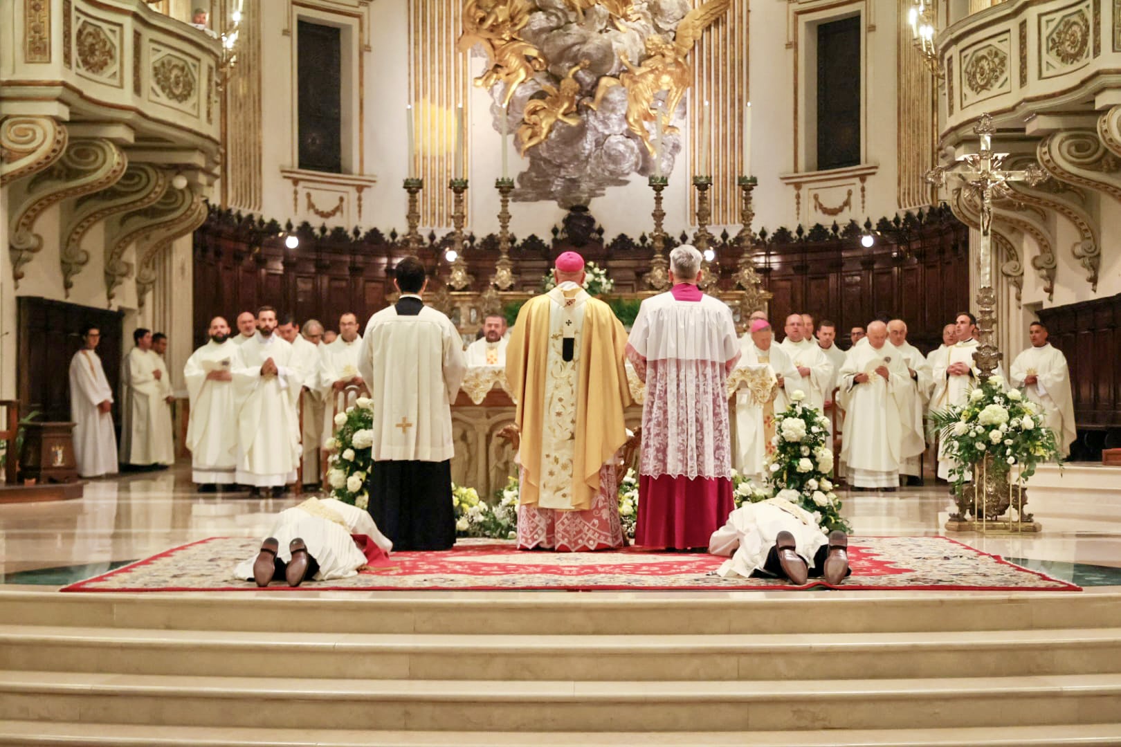 Densa e ricca di gesti è stata la celebrazione: l’ “Eccomi!” pronunciato dai diaconi prima dell’omelia, i “Si, lo voglio” a voce alta ad ogni domanda dell’Arcivescovo, le litanie dei santi cantate mentre i due diaconi erano distesi a terra, l’imposizione delle mani dell’Arcivescovo ripetute poi da tutti i sacerdoti presenti, la preghiera consacratoria, la vestizione con stola sacerdotale e casula (dopo aver tolto la stola diaconale), l’unzione delle mani col sacro crisma dei due canditati al sacerdozio e la consegna ai due del “pane e del vino” da offrire all’altare, che attraverso la preghiera eucaristica sarebbero diventati corpo e sangue di Cristo.