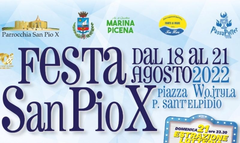 Nonostante la nuova chiesa sia stata dedicata ai Santi Giovanni Paolo II e Teresa di Calcutta, la figura di San Pio X rimane quella di riferimento per tutta la Parrocchia. Il patrono della zona nord di Porto Sant’Elpidio (che comprende i quartieri cittadini di Marina Picena e Fonte di Mare) verrà festeggiato quest’anno dal 18 al 21 Agosto. Di seguito il ricco programma: