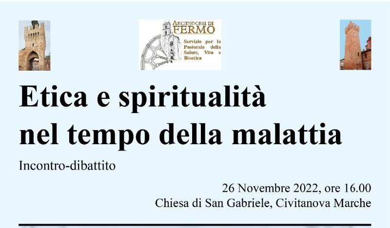 Sabato 26 Novembre 2022, dalle ore 16.00 alle ore 18.30, presso la Chiesa di San Gabriele dell’Addolorata (Civitanova Marche) si svolgerà un incontro/dibattito, aperto a tutti, sul tema “Etica e spiritualità nel tempo della malattia“, con particolare attenzione al “fine-vita”.