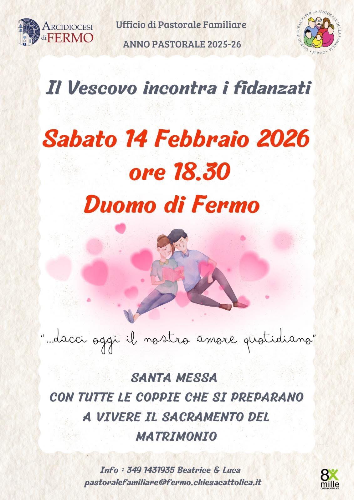 Nella stessa giornata, alle ore 18.30 nel Duomo di Fermo, il Vescovo incontrerà i fidanzati durante la Santa Messa con tutte le coppie che si preparano a vivere il Sacramento del Matrimonio, in un momento di comunione ecclesiale e di incoraggiamento al percorso intrapreso.