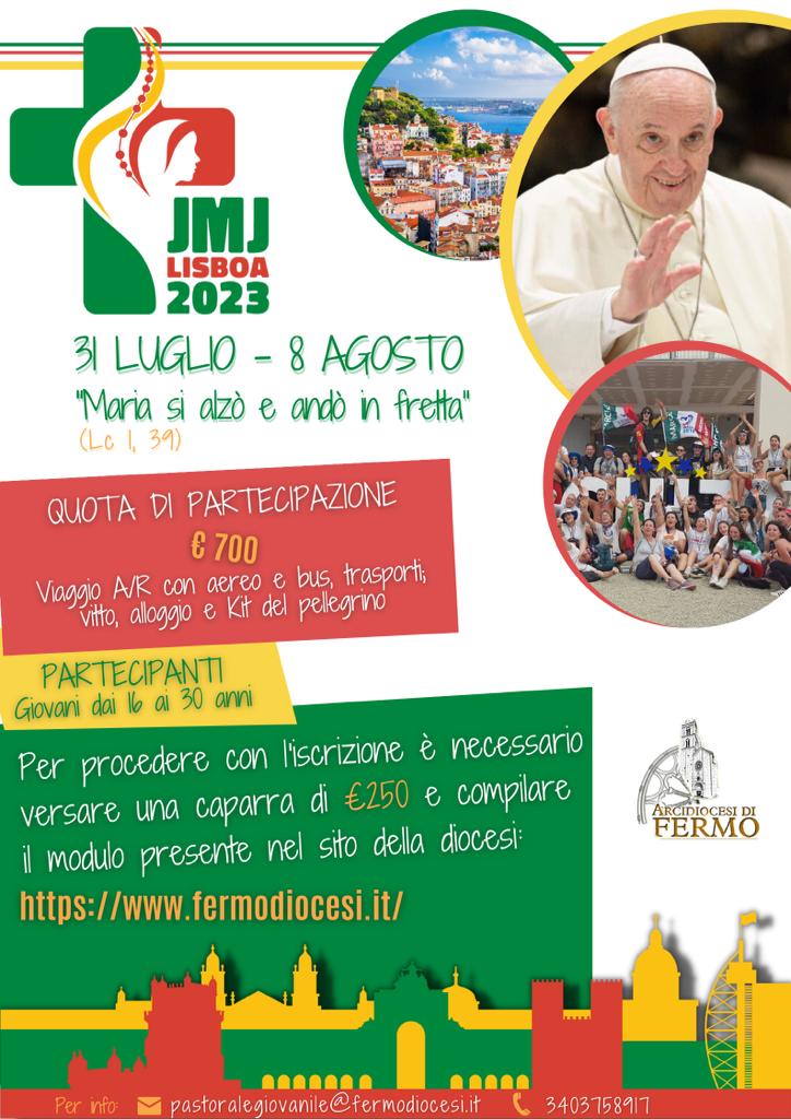 Il Servizio Diocesano di Pastorale Giovanile di Fermo annuncia che mercoledì 25 gennaio 2023, dalle ore 12.00, verranno ufficialmente aperte le iscrizioni per partecipare alla 37° Giornata Mondiale dei Giovani che si terrà a Lisbona dal 1 al 6 agosto 2023.