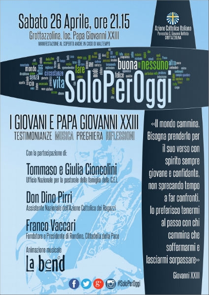 Proprio sulla base di quell’esperienza abbiamo preparato per i giovani una serata di musica, preghiera e testimonianze “forti” attorno alla figura del papa buono a partire da un suo testo noto come “Decalogo della quotidianità”. L’abbiamo intitolata SoloPerOggi e avrà luogo Sabato 26 Aprile, a partire dalle ore 21.15, a Grottazzolina, sotto il tendone approntato presso il monumento a Papa Giovanni, nel quartiere omonimo (Strada Fermana).