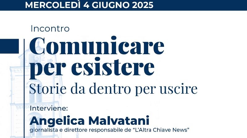 La mattinata proseguirà con un secondo evento, aperto a tutti, in programma alle ore 10.30 in Piazza del Popolo, al centro culturale San Rocco, dal titolo “Comunicare per esistere, Storie da dentro per uscire”, con la presenza di Angelica Malvatani, giornalista e direttore responsabile de “L’Altra Chiave News”.