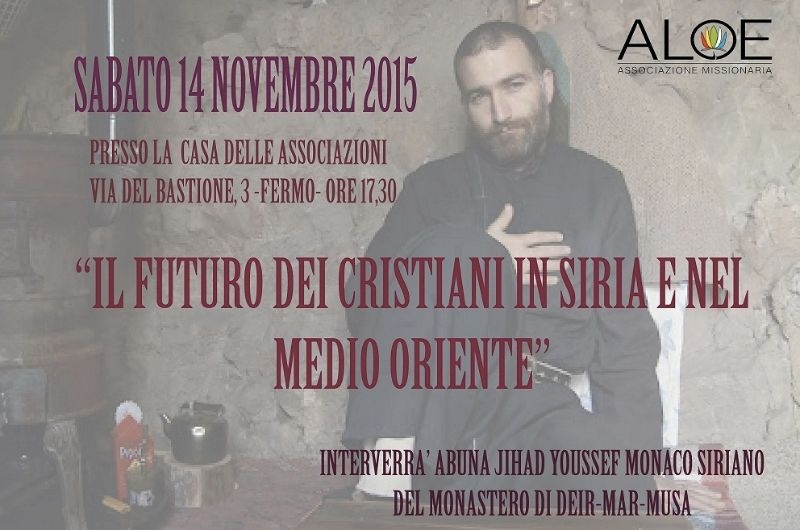 ABUNA JIHAD YOUSSEF, è un monaco siriano della comunità di MAR MUSA, fondata da PADRE PAOLO DALL’OGLIO, da oltre due anni nelle mani dell’ISIS. Abuna Jihad è ormai un amico della Città di Fermo per aver tenuto diversi incontri in città, sempre organizzati da ALOE Onlus. Ora torna per parlarci di quale sarà il futuro dei cristiani nel suo paese martoriato e in genere nel Medio Oriente, una presenza bimillenaria che ora rischia di scomparire. Un testimone di eccezione dunque, perchè Abuna Jihad vive abitualmente a MAR MUSA, nel suo monastero tutto dedicato al difficilissimo dialogo con l’Islam.
