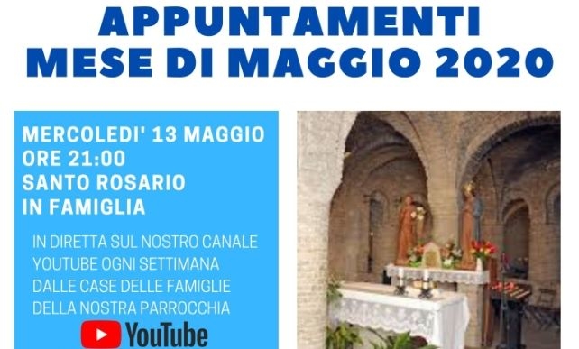 Mercoledì 13 Maggio alle ore 21:00 con la recita del Santo Rosario in diretta sul nostro canale Youtube dalle case di alcune famiglie della nostra parrocchia.