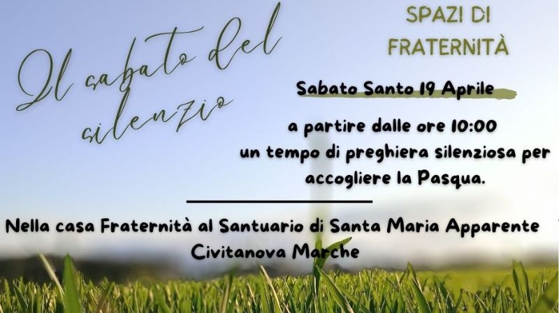 Un tempo di silenzio e deserto per mettersi di nuovo di fronte e dentro la presenza del Risorto che celebreremo domenica prossima con la Pasqua. Chi vuole, per il tempo che desidera e ha a disposizione, nella casa fraternità di Santa Maria Apparente (Civitanova Marche) a partire dalle ore 10:00, ci sarà modo di vivere e condividere un tempo di ascolto, nella cappellina Charles de Foucauld ed utilizzare anche gli spazi verdi intorno alla casa e al santuario. Si conclude con il pranzo condiviso con la modalità ormai collaudata (ognuno porta qualcosa). Non è necessario prenotarsi.