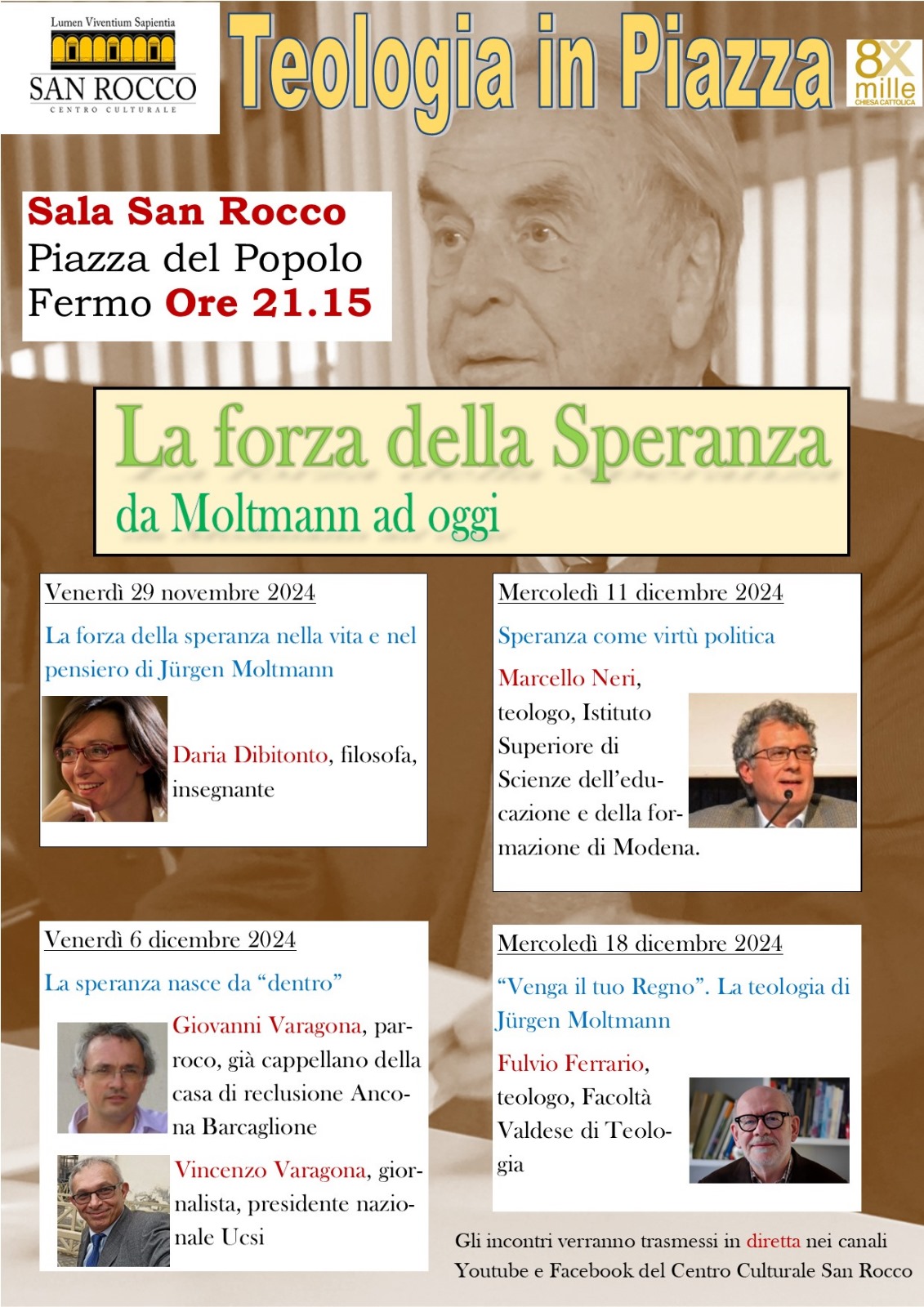 Il Centro Culturale San Rocco della Diocesi di Fermo ha organizzato l’ormai consueto ciclo di incontri “Teologia in Piazza”, con il quale vuole dare rilievo al ruolo che la teologia ha nella vita sociale, politica e culturale delle città. Quest’anno, in preparazione del Giubileo, il tema scelto è quello della speranza.
