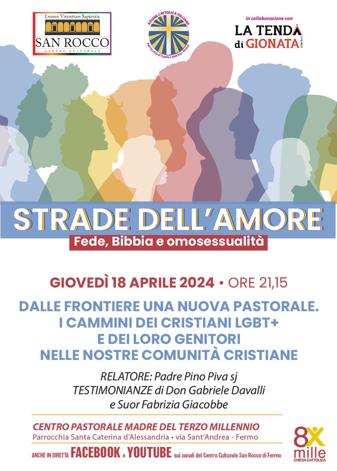 Giovedì 18 Aprile alle ore 21.15, presso il Centro Pastorale "Madre del Terzo Millennio" della parrocchia Santa Caterina di Fermo, si svolgerà il terzo ed ultimo incontro del ciclo "Strade dell'amore. Fede, Bibbia e omosessualità"