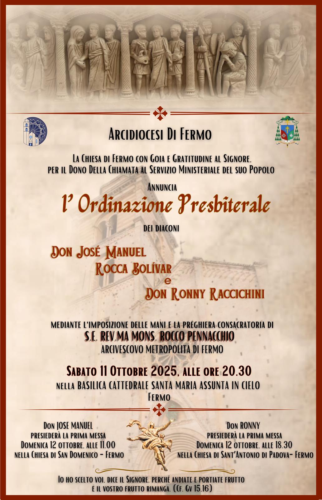 Sabato 11 ottobre i diaconi transeunti Josè Manuel e Ronny verranno ordinati presbiteri. Si rinnova la grande festa per l’Arcidiocesi di Fermo già vissuta lo scorso 22 febbraio, quando Josè Manuel Rocca Bolivar e Ronny Raccichini vennero ordinati diaconi da S.E. Mons. Rocco Pennacchio.