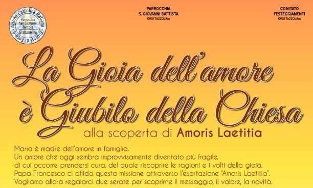 Nelle prime due serate, 29 30 maggio, nella Chiesa di San Giovanni Battista, ci saranno due occasioni di ascolto e dialogo a partire da Amoris Laetitia: il primo incontro, che avrà come ospiti Enrico e Giovanna Peroli, sarà dedicato alla sfida dell’amore quotidiano, la sua crescita, la sua fioritura, il suo cambiamento; il secondo incontro, guidato dal Cardinale Edoardo Menichelli, vescovo di Ancona, cerca di affrontare il tema difficile, delicato, decisivo di come farsi prossimi di chi non crede nel vincolo dell’amore coniugale o di chi porta le ferite di un amore finito, tradito, interrotto.
