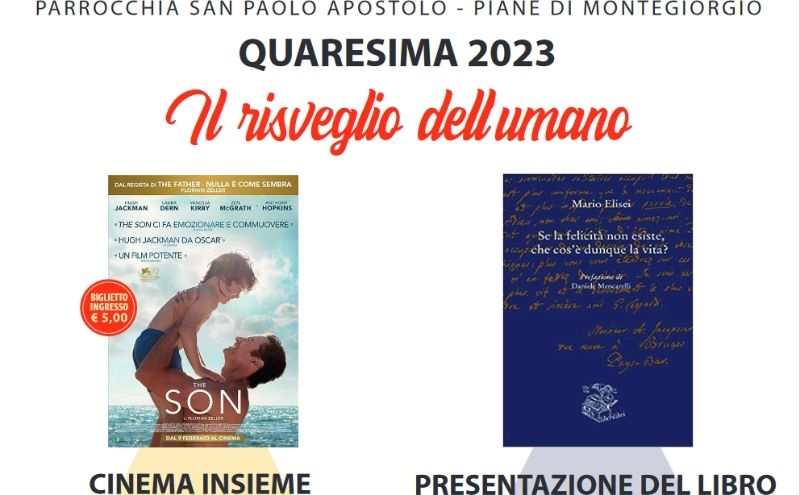 La parrocchia San Paolo Apostolo in Piane di Montegiorgio è lieta di invitarvi ad un ciclo di tre incontri “Il Risveglio dell’Umano” per riflettere insieme e viver il periodo di Quaresima e Pasqua 2023: si inizia Sabato 11 Marzo ore 21.00 con la visione del film “The Son” al CineManzoni di Montegiorgio. Giovedì 16 presentazione del libro “Se la felicità non esiste cos’è dunque la vita?” con la presenza dell’autore Mario Elisei alle ore 21.15 nel salone parrocchiale della Chiesa di San Paolo Apostolo. Domenica 26 Marzo ore 13.00 pranzo di solidarietà per i territori di Siria e Turchia colpiti dal terremoto.