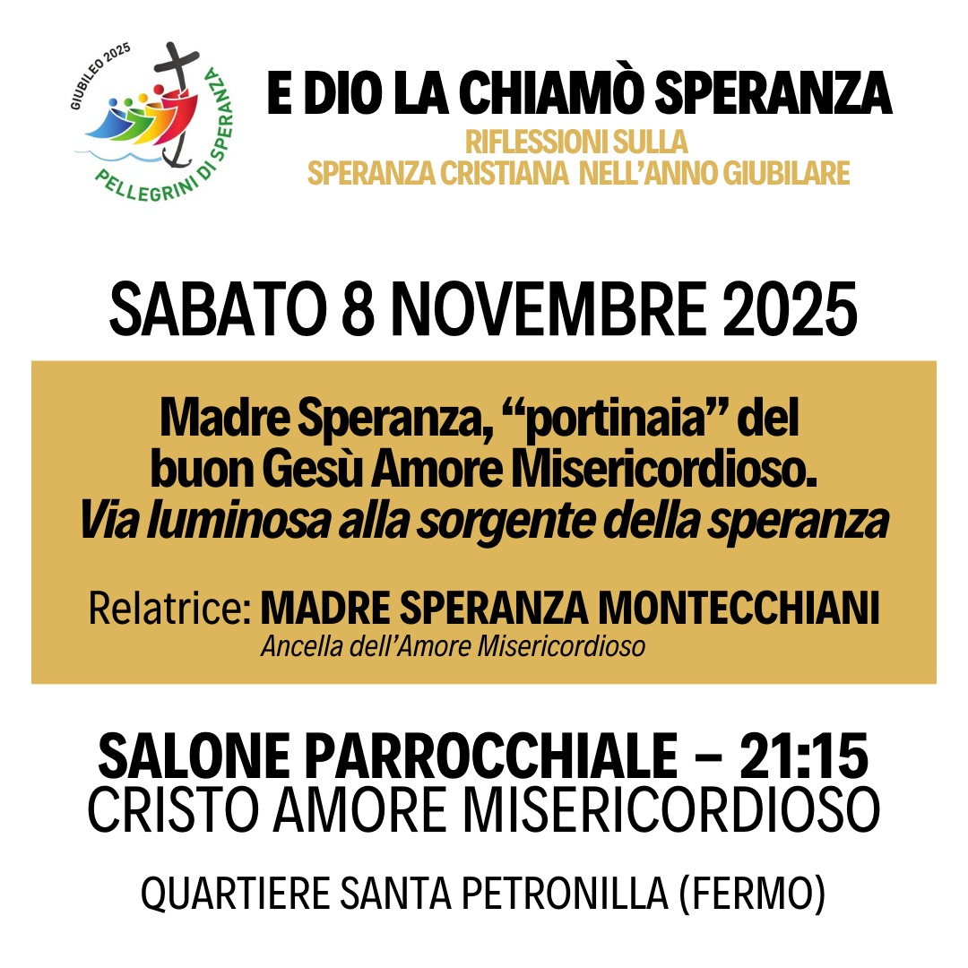Sabato 8 novembre, alle ore 21.15, presso il Salone della Parrocchia Cristo Amore Misericordioso a Fermo, si terrà l’ultimo incontro del ciclo sulla Speranza Cristiana nell’anno Giubilare. Relatrice sarà Madre Speranza Montecchiani, EAM, che presenterà un’interessante meditazione dal titolo: “Madre Speranza, “portinaia” del buon Gesù Amore Misericordioso. Via luminosa alla sorgente della speranza”.