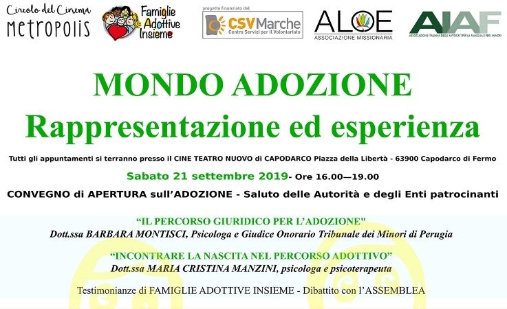 L’Associazione Famiglie Adottive Insieme, in continuità con la serie di seminari sulle tematiche e problematiche dell’adozione relative al mondo della scuola e della società in generale, offerti negli scorsi anni in collaborazione con alcuni istituti scolastici del fermano, propone per il prossimo autunno una nuova interessante iniziativa formativa sull’Adozione: un corso di formazione a partire dal cinema. Tale iniziativa formativa è indirizzata sia alla società civile in generale ed in particolare al mondo delle famiglie interessate, ma anche agli ambiti professionali coinvolti nelle problematiche dell’affido e dell’adozione, come docenti, avvocati, psicologi ed assistenti sociali. Il corso di formazione, dal titolo “Mondo Adozione: Rappresentazione ed esperienza” si concretizza in sette moduli o incontri pomeridiani che andranno dal 21 settembre al 1 dicembre.
