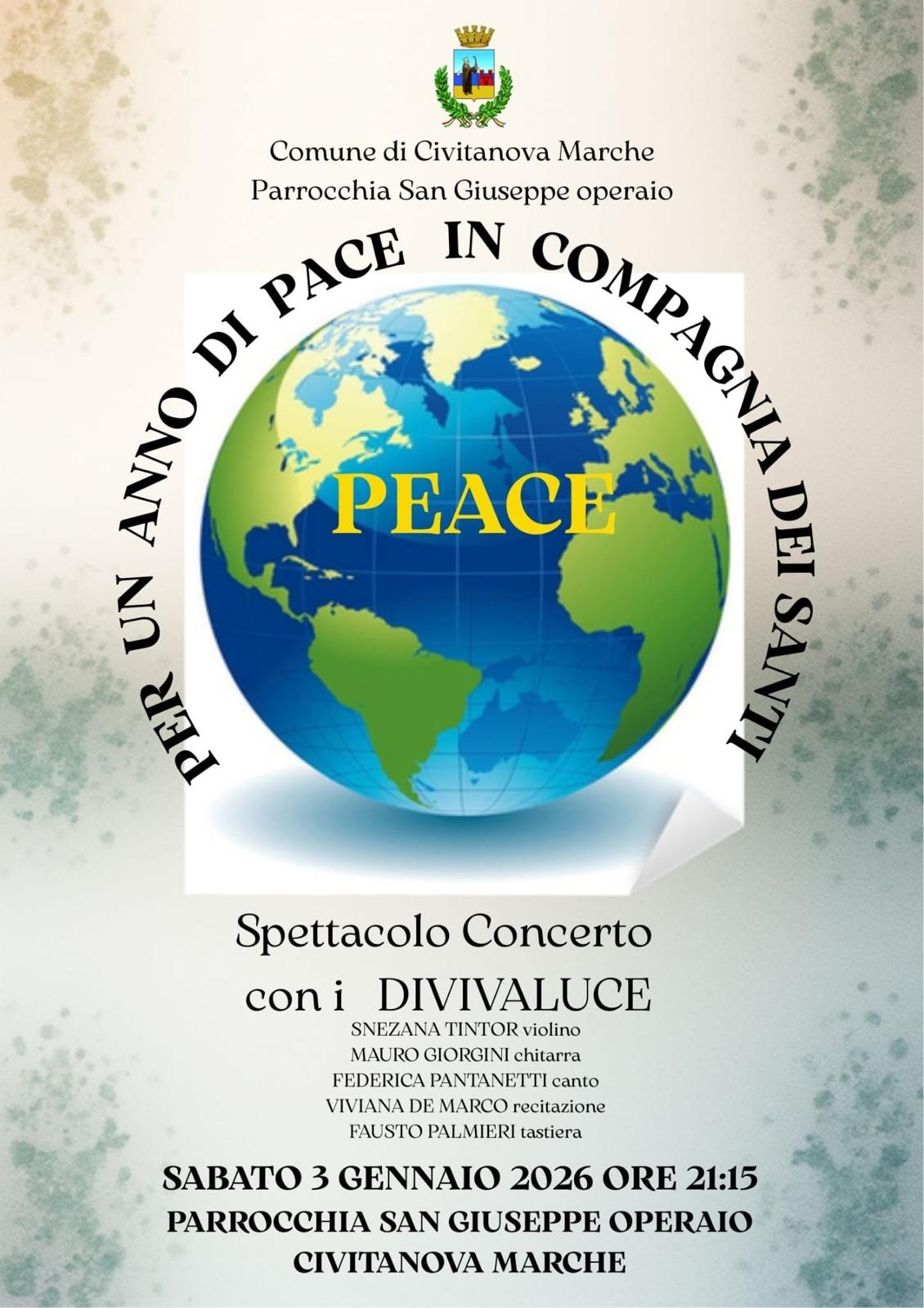 Organizzato dalla Parrocchia San Giuseppe Operaio e dal Comune di Civitanova Marche, “Peace: per un anno di pace in compagnia dei Santi” vuole essere un momento di spettacolo e riflessione sul tema della Pace, accompagnati e guidati dalle figure dei santi.