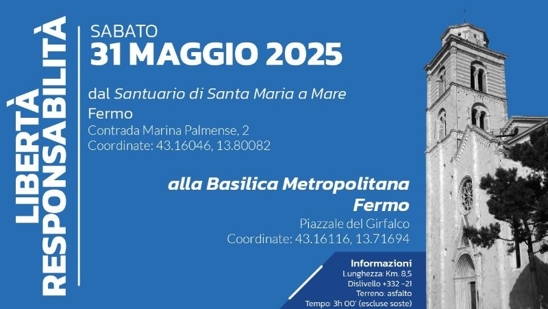 Libertà/Responsabilità: sarà questo il tema del terzo pellegrinaggio a piedi verso la Cattedrale di Fermo il prossimo sabato 31 maggio 2025.