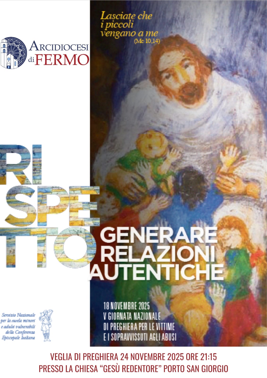 “I temi della giornata – commenta Francesco De Angelis, Responsabile dell’Ufficio per la tutela dei minori e degli adulti vulnerabili della diocesi di Fermo – sono il RISPETTO e la costruzione di RELAZIONI AUTENTICHE, che si ispirano alle parole di Gesù: «Lasciate che i piccoli vengano a me» (Mc 10,14). La Veglia – continua De Angelis – vuole essere un momento in cui riunirsi per guardare con verità e dolore la ferita degli abusi e per continuare con speranza e conversione la lotta contro ogni violenza verso i piccoli, i fragili e gli indifesi. Siamo chiamati a riconoscere la dignità di ogni persona e a costruire un amore protettivo attraverso l’esempio di Gesù che ci chiede di rispettare, accogliere e benedire le persone vulnerabili e i bambini”.