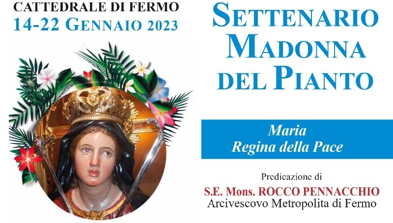 Predicatore dell’edizione 2023, dal titolo “Maria, Regina della Pace”, sarà l’Arcivescovo di Fermo, S.E. Mons. Rocco Pennacchio, che con la sua presenza rafforzerà sicuramente la dimensione diocesana del Settenario. Infatti, nonostante ad essere coinvolte siano maggiormente le parrocchie della vicaria di Fermo, non va dimenticato che la devozione alla Madonna del Pianto supera i confini della città, aprendosi ad un respiro diocesano.