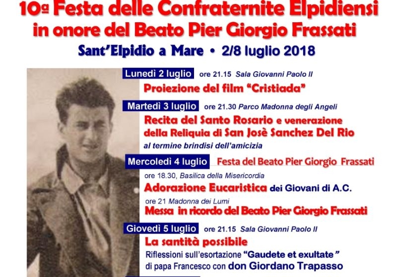 SANT’ELPIDIO A MARE – Dal 2 all’8 luglio torna la Festa delle Confraternite elpidiensi in onore del Patrono beato Pier Giorgio Frassati. Giunta alla 10.a edizione, è promossa dalle Confraternite della Misericordia, del SS Sacramento, del Carmine e dalla Scuola di Sant’Antonio, insieme al Laboratorio Frassati, alla Parrocchia, con il patrocinio della Commissione diocesana per le Confraternite e del Comune.