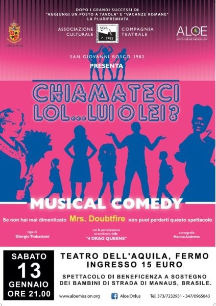 La Compagnia Teatrale San Giovanni Bosco 1982, con un ricchissimo curriculum di spettacoli che durano da ben 35 anni, torna alla ribalta con un nuovo Musical Commedy CHIAMATECI LOL … LUI O LEI?, liberamente tratto dal grande successo di Robin Williams MRS DOUBTFIRE.