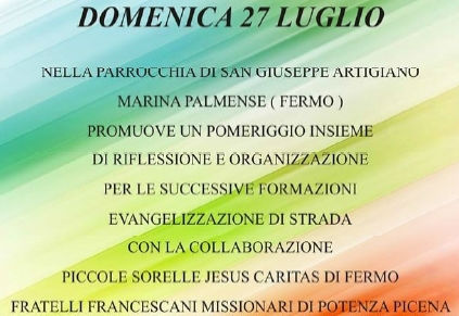 La Pastorale Giovanile dell’Arcidiocesi di Fermo organizza una serata di preghiera e incontro dedicata all’evangelizzazione di strada. Oltre a verificare il cammino fatto negli ultimi mesi, esamineremo insieme il programma del mini-corso di evangelizzazione che si terrà il prossimo autunno presso la parrocchia San Giuseppe Artigiano di Marina Palmense. Il corso è un itinerario di ascolto, confronto e preghiera suddiviso in sei incontri, il cui obbiettivo è stimolare i giovani a essere strumento nel condurre a Dio i propri coetanei. È prevista la presenza di relatori provenienti da movimenti ed esperienze diversi, convergenti però nell’unico desiderio che tutti giungano a Dio. Alcuni dei relatori presenti saranno Don Fabio Rosini, Don Antonio Nepi e Don Emilio Rocchi. In ciascun incontro ci sarà anche la testimonianza di un giovane della nostra Diocesi.