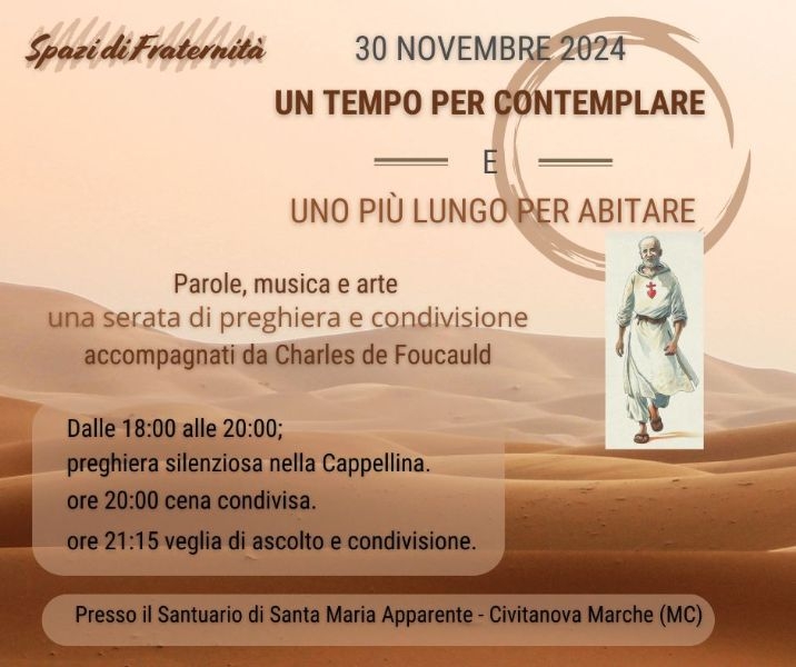Un invito per ognuno e da estendere. Sabato 30 novembre presso il Santuario di Santa Maria Apparente (Civitanova Marche) vi invitiamo a condividere un tempo di Parole, musica e arte, sulle tracce di fratel Charles de Foucauld. La proposta si articola in tre momenti a cui poter partecipare in relazione alle proprie disponibilità: dalle ore 18:00 la cappellina dell’adorazione, sarà aperta per un tempo di deserto e ascolto, attraverso la preghiera silenziosa condivisa. Per chi vuole, alle ore 20:00, si condivide la cena nella modalità ormai consolidata ( ognuno porta del cibo da mettere a tavola), mentre alle ore 21:15 nella chiesetta del santuario ci sarà una veglia caratterizzata dall’ascolto di brevi passaggi dagli scritti di Charles de Foucauld e altri autori, accompagnati da musica dal vivo. Una pittrice darà forma alle parole ascoltate, attraverso la realizzazione di un quadro man mano che le stesse verranno lette, diventando una sorta di icona che racchiuderà l’esperienza. La caratteristica di Spazi di Fraternità, come ormai sapete e avete sperimentato, è quella di creare appunto uno spazio di relazioni e condivisione, nella cura reciproca e nell’approfondimento della dimensione della spiritualità, aperta a tutti. Non serve prenotare, né dare conferma alcuna, si viene con l’animo disponibile ad accogliere ed essere accolti.