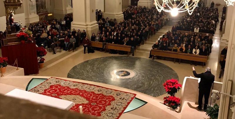 L’impatto, entrati in chiesa, lasciava senza fiato. Più di mille giovani provenienti da tutta l’Arcidiocesi di Fermo si sono ritrovati in Cattedrale ieri sera, venerdì 17 gennaio, all’incontro organizzato per loro all’interno del Settenario del Pianto. “L’attenzione ai giovani – spiega don Paolo Scoponi, vicario foraneo e Presidente della Commissione per la promozione della devozione alla Madonna del Pianto – è stato il primo pensiero avuto nel programmare il Settenario. In linea con il convegno diocesano di inizio anno pastorale (che ha avuto al centro i giovani), da subito si è voluta pensare ad una importante serata “a tema” all’interno di uno straordinario momento di grazia e fede qual è il Settenario del Pianto: una devozione forte nella città ma anche in tutta la diocesi, che mette al centro Maria, Madre della Chiesa, Madre dei Giovani. Ecco allora – conclude don Paolo – l’invito a Rosini”. Don Fabio ha parlato per un’ora e venti minuti: tanti gli stimoli di riflessione offerti, tante le parole capaci di scaldare il cuore di tutti i giovani intervenuti, rimasti attenti dall’inizio alla fine. “Con Maria, la donna del Si” il titolo che ha ispirato l’intervento di don Rosini, il quale, partendo da un simpatico ricordo di quando era bambino un po’ impaurito di fronte alla statua della Madonna con le 7 spade in casa dalla nonna, ha poi avviato un interessantissimo commento al brano dell’annunciazione. Un brano che vede Dio fare la prima mossa nel cercare Maria (come cerca ed ama ciascuno di noi), vede l’angelo Gabriele portare un bel messaggio (come tanti angeli che incontriamo anche noi nella nostra vita), vede Maria inizialmente turbata ma accogliente e capace di sconfiggere le paure (come turbati siamo anche noi quando dimentichiamo che, insieme al Signore, non dobbiamo avere paura di niente). Davvero interessante la riflessione sulla bellezza di quello che i giovani già sono, senza rincorrere modelli che non li appartengono e che li distraggono dall’apprezzare quello che sono, a partire dai limiti che invece, se accolti, possono essere importanti occasioni di crescita. Unanimi i commenti dei presenti: serata splendida, indimenticabile, di riflessione e crescita nella fede. Un serata che ha saputo far incontrare i giovani con Maria, e che ha permesso alla Madonna del Pianto di riaffacciarsi in diocesi con una devozione intanto ricordata, ma che saprà pian piano ritrovare forza e slancio.